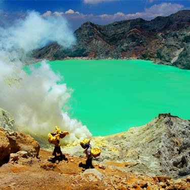 Une ascension d'1h30 est necessaire pour rejoindre le cratère avec son sublime lac vert. Ici, les porteurs de soufre travaillent durement dans les émanations du volcan.
